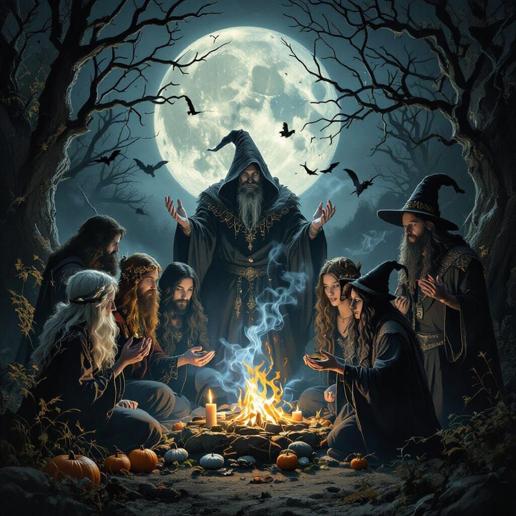 This image depicts seven witches, both male and female, celebrating the Samhain festival as a deity manifests before them.