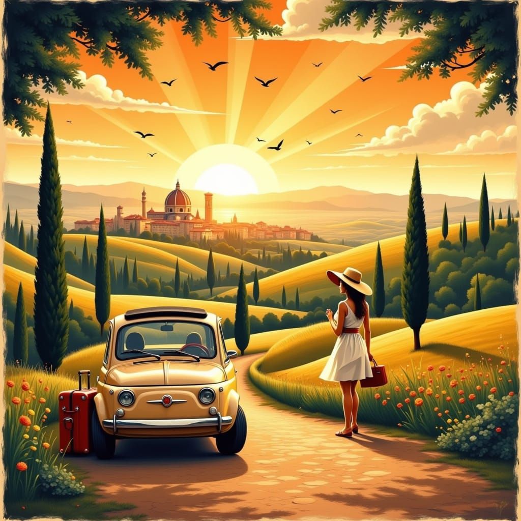 A vintage Italian scene with rolling hills, cypress trees, and an old Fiat 500. A woman in a summer dress gazes at Florence in golden hour light, evoking nostalgia. Painterly style.