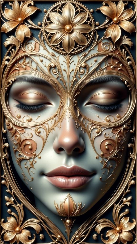 A detailed tapestry featuring transparent filigree and intricate patterns. The image evokes art nouveau style with an ethereal quality, reminiscent of digital art.