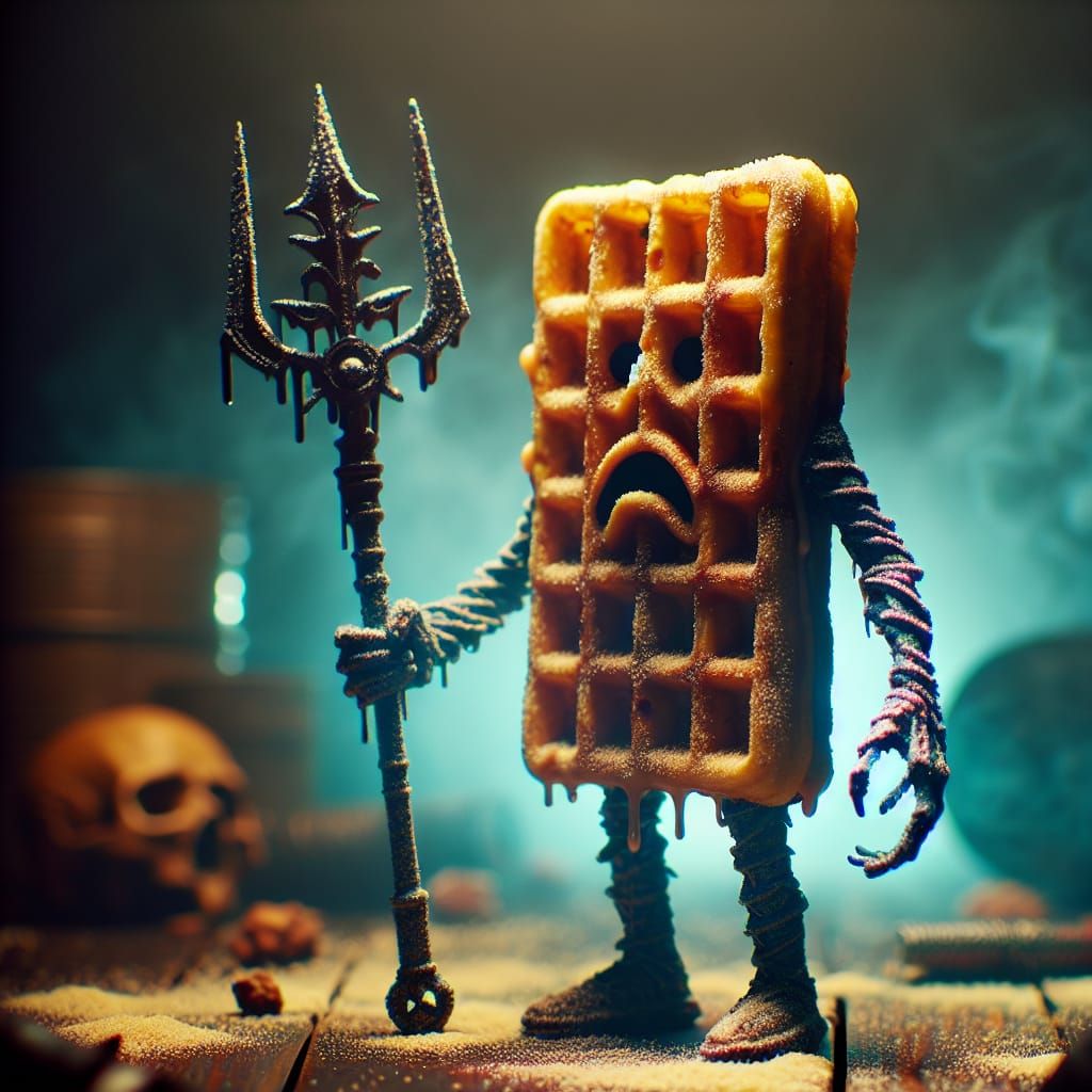 This image shows an anthropomorphic waffle warrior holding a battle staff. The highly detailed, centered image features vibrant colors, sharp focus, and an analog style reminiscent of Romanticism, set against a grungy, dystopian backdrop.