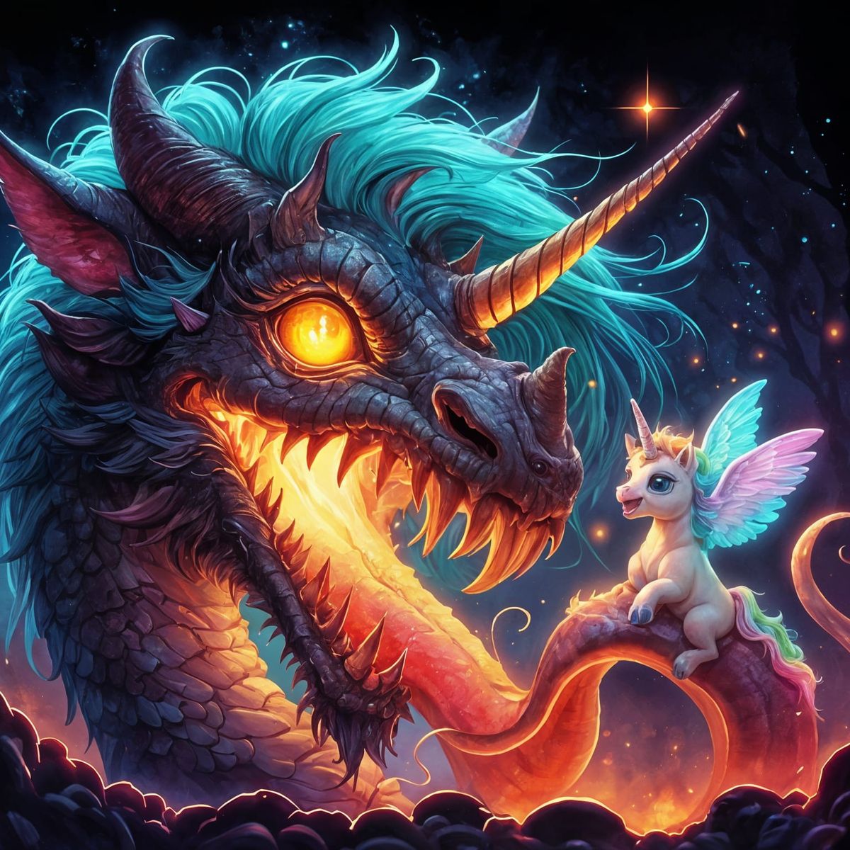 The color alone, and the juxtaposition of a fierce dragon with a cute unicorn, and such perfect composition! I showed this to several non-NC users and they all loved it! Beautiful vision!