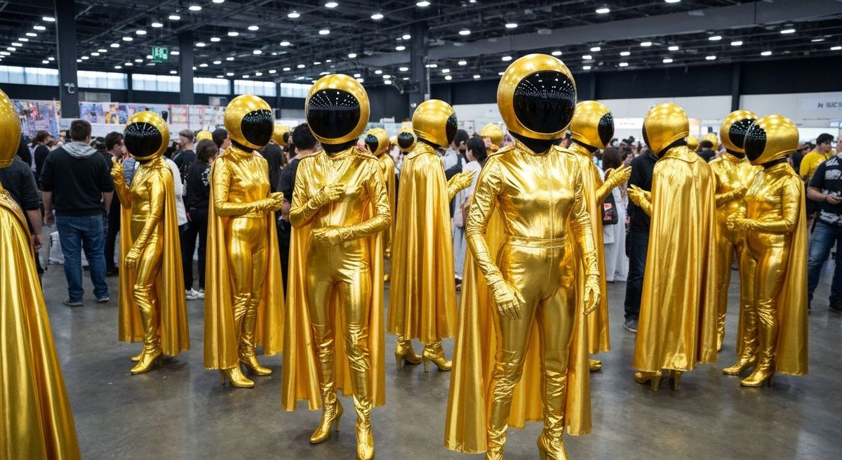 This image captures a vibrant cosplay convention where attendees wear dazzling full-body chrome rubber suits, latex capes, and high-heeled boots.