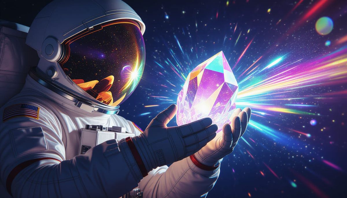 A mesmerizing image showing an astronaut's hand holding a crystal that scatters light into rainbow colors, creating a cinematic and magical atmosphere with vibrant film grain.
