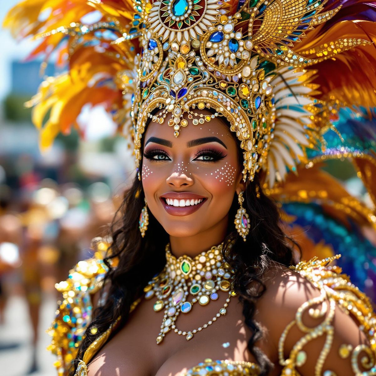 This image shows a beautiful Brazilian woman celebrating Carnival in a glittering sequined costume. The photorealistic image captures the joy and splendor of the celebration with vivid colors and intricate details.