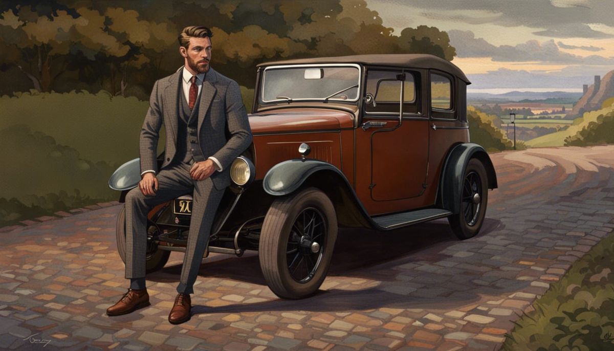 This image shows a muscular man in a tweed suit standing next to an Austin 7 car, with a manor house in the background under a twilight sky. The style is splash art with intricate detail and dramatic lighting.