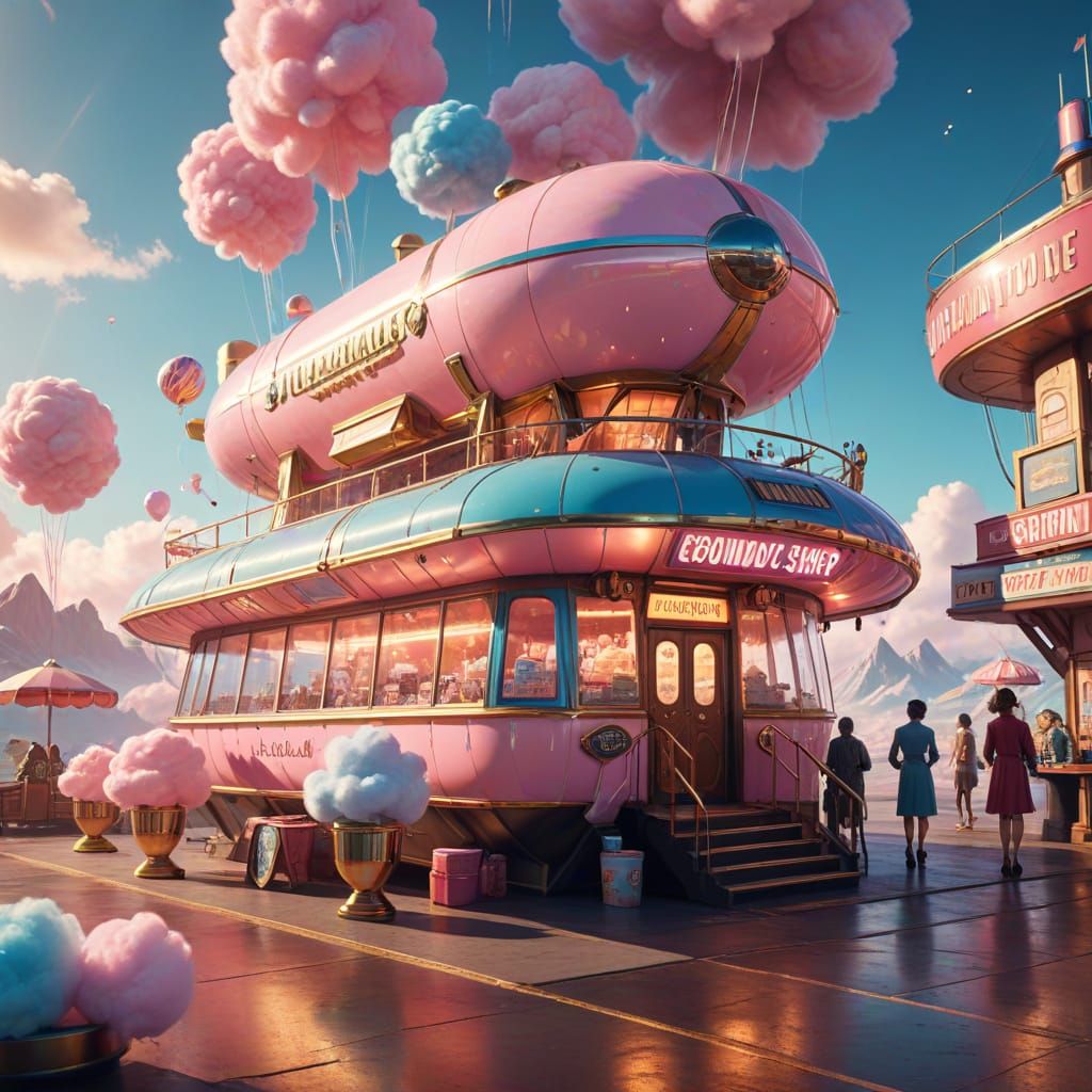 A vibrant, retro-futuristic illustration of a whimsical cotton candy shop aboard an airship. The image has polished metal details, golden hour lighting and a cinematic, sci-fi aesthetic.