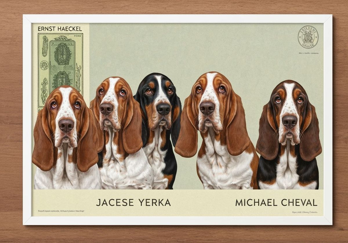 This AI-generated image features four Basset Hounds looking directly at the viewer. The artwork is colorful and unframed, inspired by surreal and biological illustration styles.