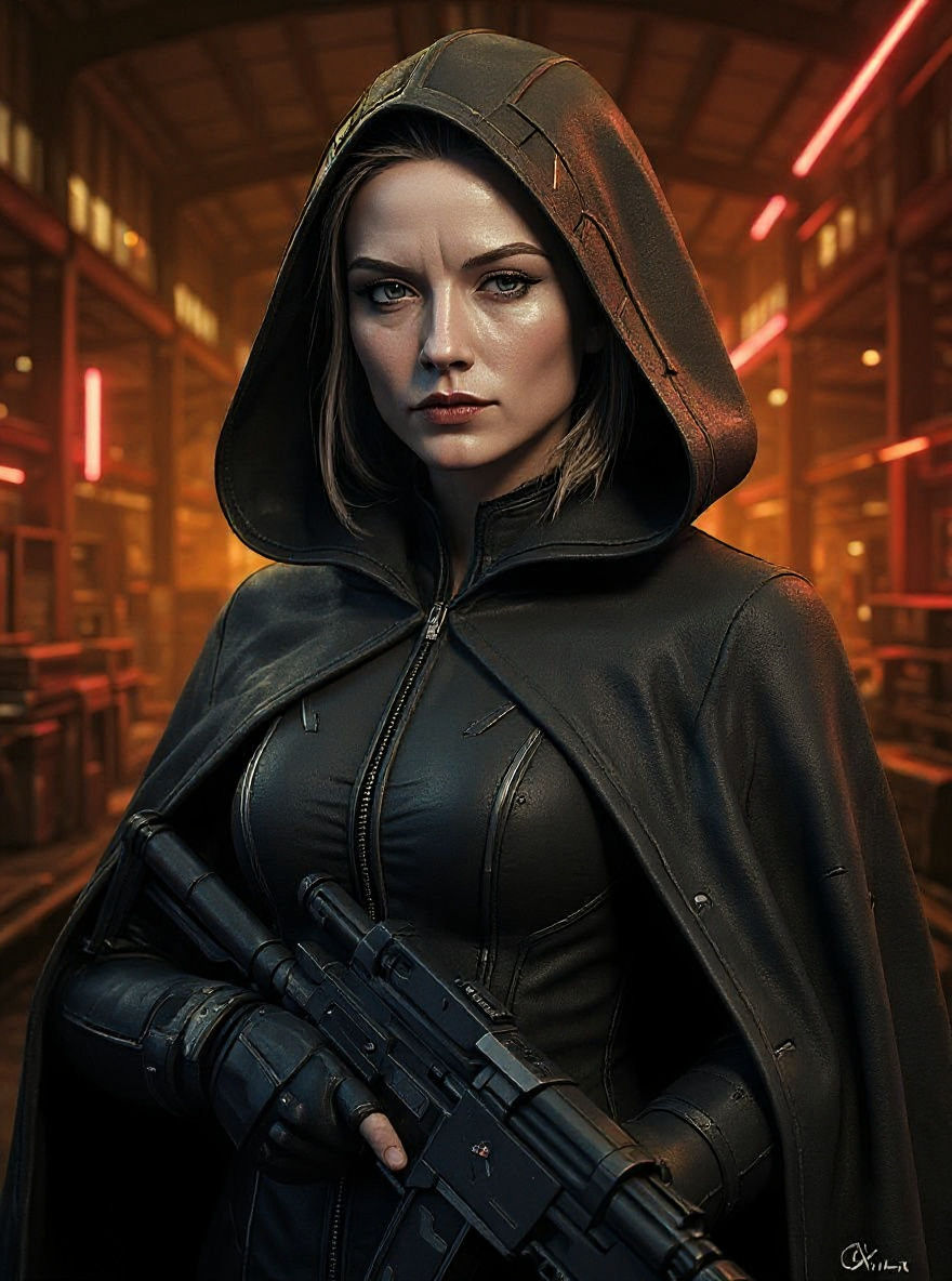 This image shows a woman on a mission on planet Tuldaren II, equipped with a blaster featuring a techy scope. The scene evokes a sci-fi adventure.