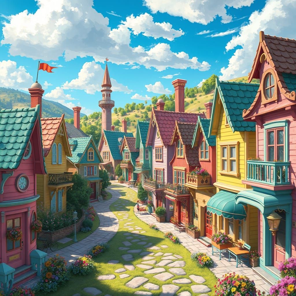 A vibrant image of a whimsical candy-colored village under a bright blue sky. The ultra-realistic fantasy art style features playful details and intricate textures, creating a happy and inviting scene.