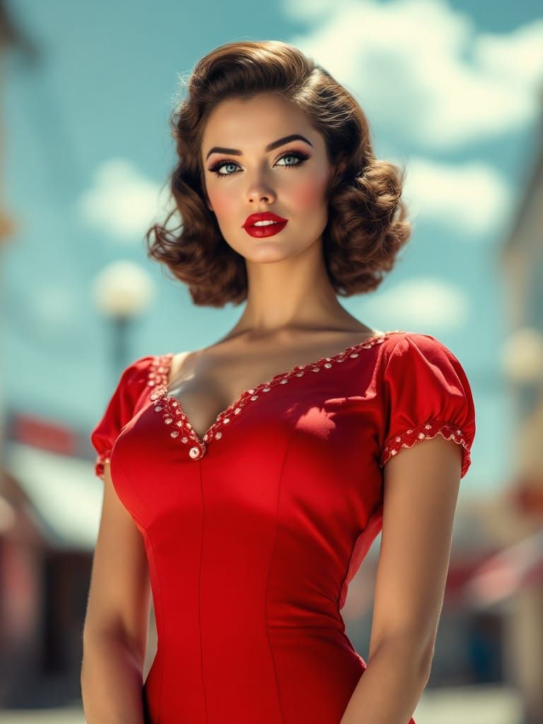 A full-body 1950s pin-up woman in a vibrant red dress makes direct eye contact. The image features enhanced color saturation and deep blue skies, reminiscent of a polarizing filter effect.