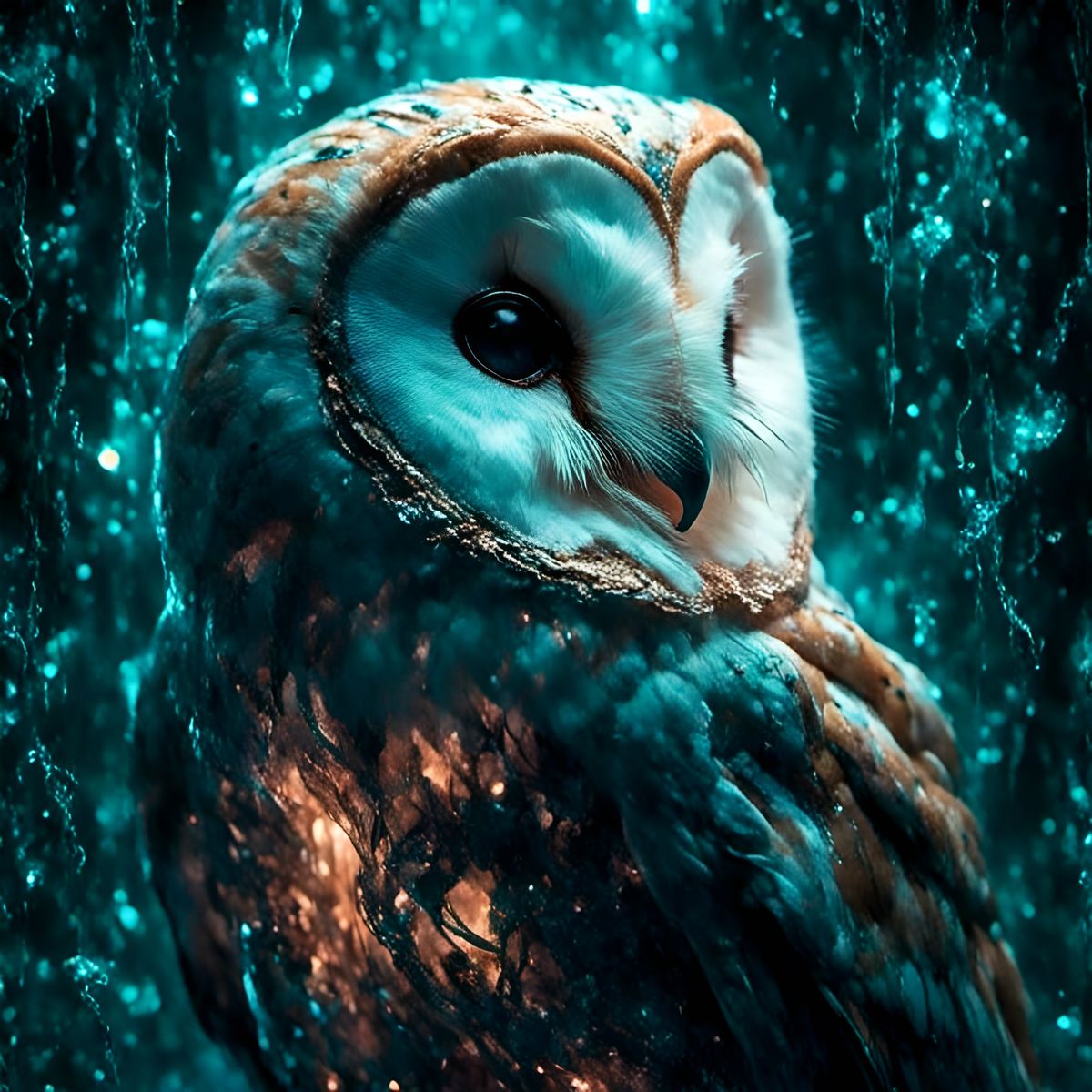 This image shows a barn owl that appears as a glowing monster. The artwork incorporates dark and dreamy elements, creating a surreal and slightly unsettling effect.