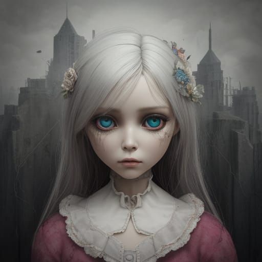 A surrealist image featuring a decaying porcelain doll with chipped paint, sitting amongst bright building blocks. The art style is reminiscent of macabre, deeply disturbing visuals with a sickly sweet color palette.