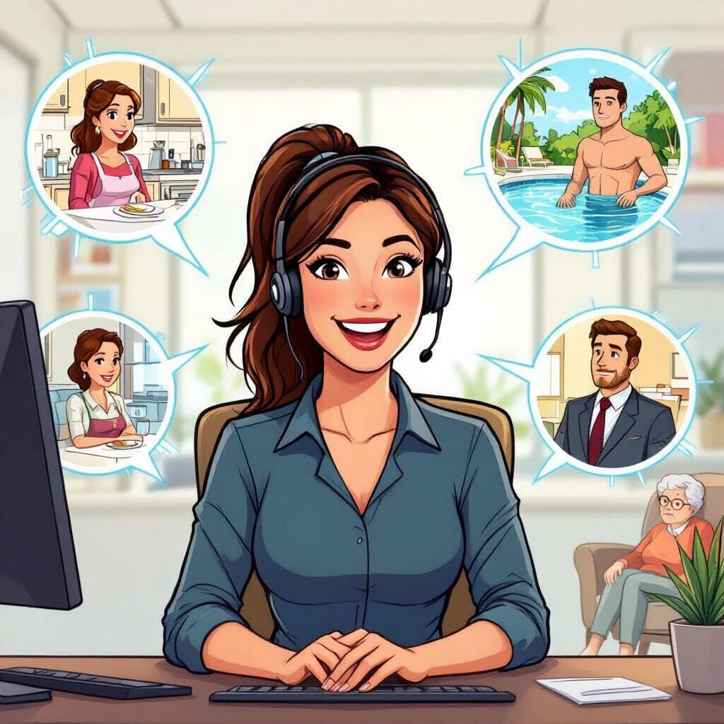 This image shows a cheerful woman at her desk, connected by beams to diverse people in comic-style bubbles. The scene is rendered in a vibrant, simplified aesthetic with clean lines and soft glows.