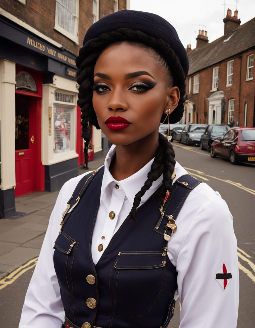 This image shows a young working-class woman in 1969 East London. She embodies the skinhead style with a shaved hairstyle and Dr. Martens boots, reflecting a blend of British and Jamaican influences.