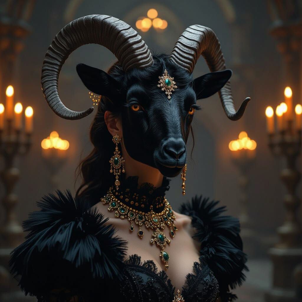 A striking picture of a woman with a goat's head, featuring black fur and horns. She wears baroque jewelry inside a dark castle illuminated by candlelight, in a dark fantasy style.