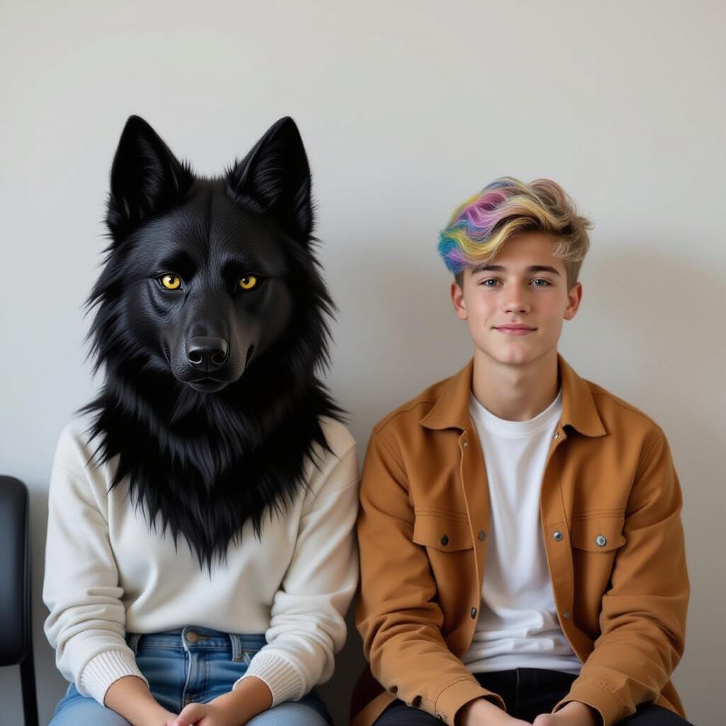 This image shows two teenagers in a waiting room. One wears a black therian mask with blue hair strands showing, the other has pastel-colored hair. The scene has a cinematic, film-like quality.