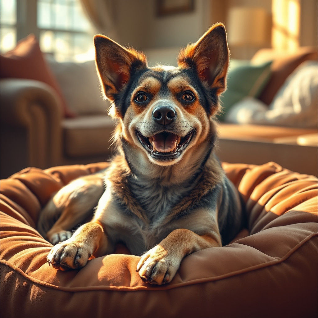 A charcoal sketch of a dramatic scene of an ancient, dirty street dog laying comfortably on a luxurious dog bed with a silly and fun loving expression. The old dog's fur is groomed and clean, and he is safe in his new forever-home. The background is blurred and contains furniture in a family home's living ...