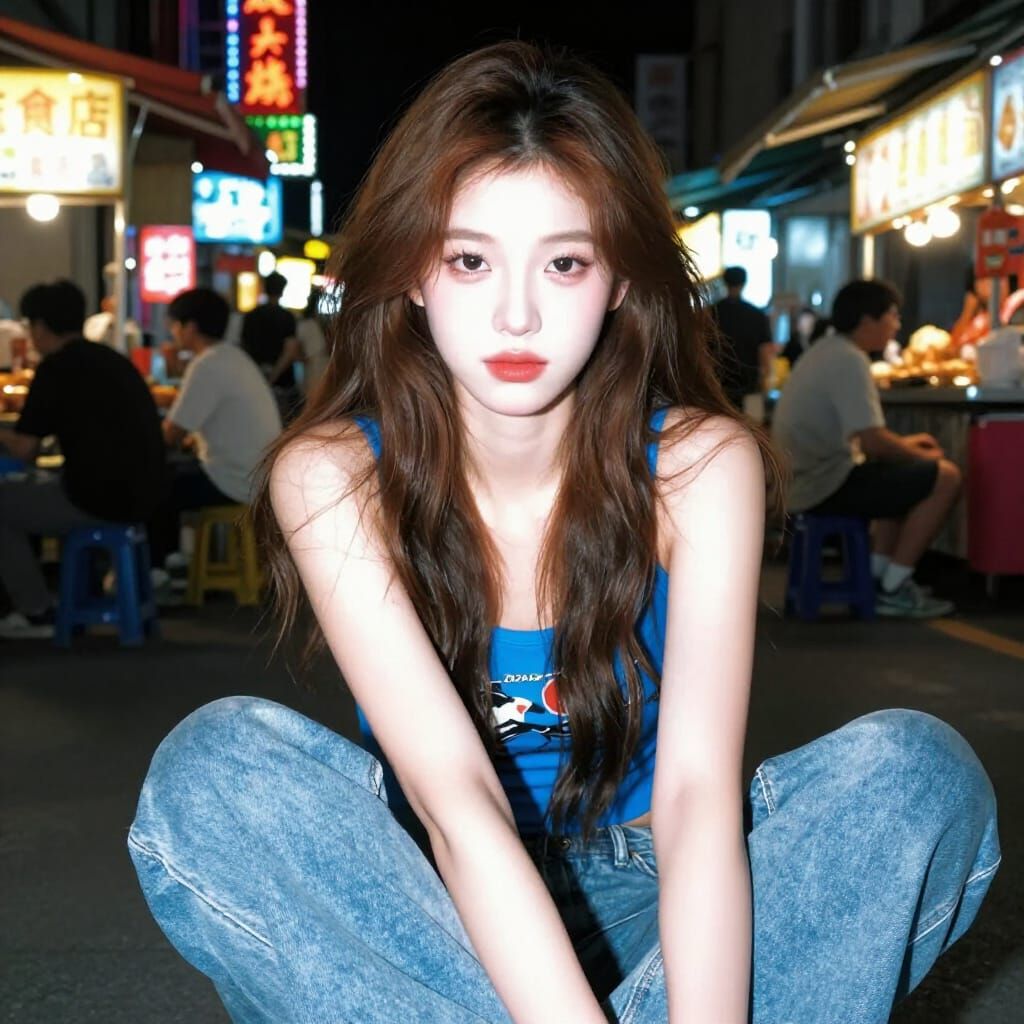 This image captures a young Asian woman in a Y2K flash photography style, illuminated by direct flash in a neon-lit night market. It features a glowing, overexposed aesthetic with radiant skin and a candid street vibe.
