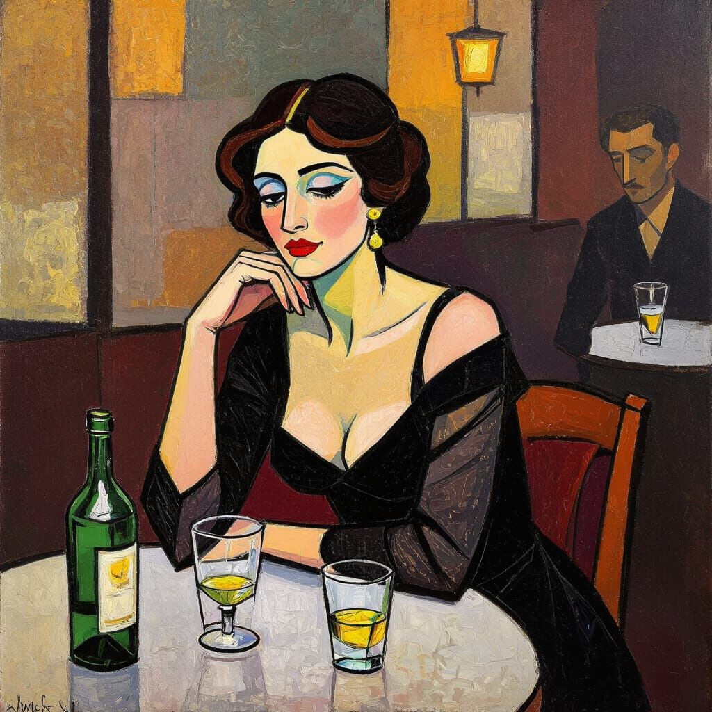 A vivid, cubist-style portrait of a woman at a cafe. The artwork captures the essence of early 20th-century expressionism with bold strokes and vibrant colors.