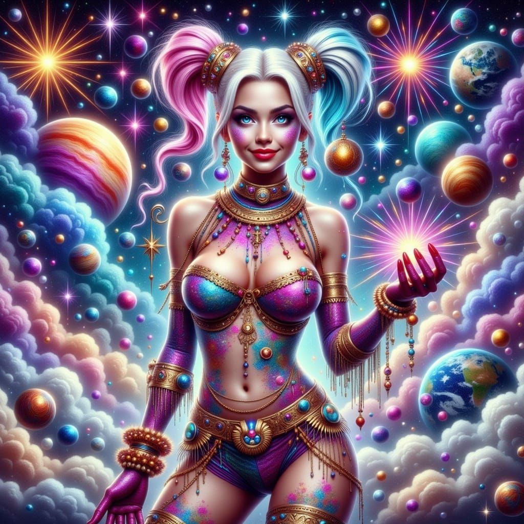 This image depicts Harley Quinn as a mystical zodiac goddess in a vibrant, surreal environment filled with cosmic symbols and astrology-inspired accessories, created in a bold, impasto style with a mix of digital and traditional textures.