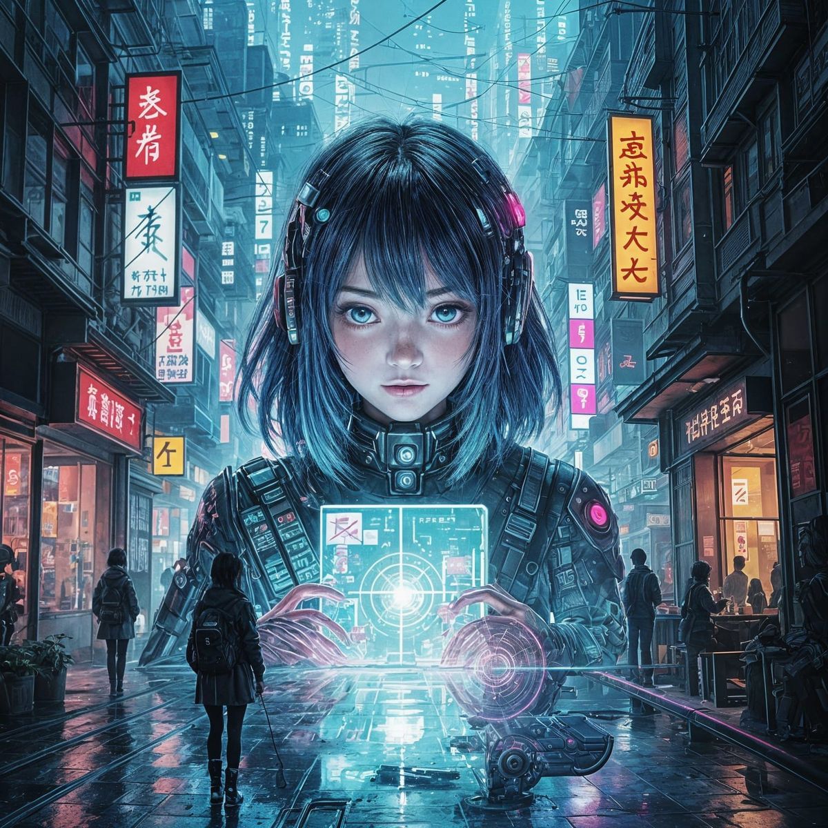 This image shows a giant cyberpunk Hanako in a cybernetic universe. Hanako is made of electronic circuit boards covered in bioluminescent moss. The scene is an unexpected watercolor.