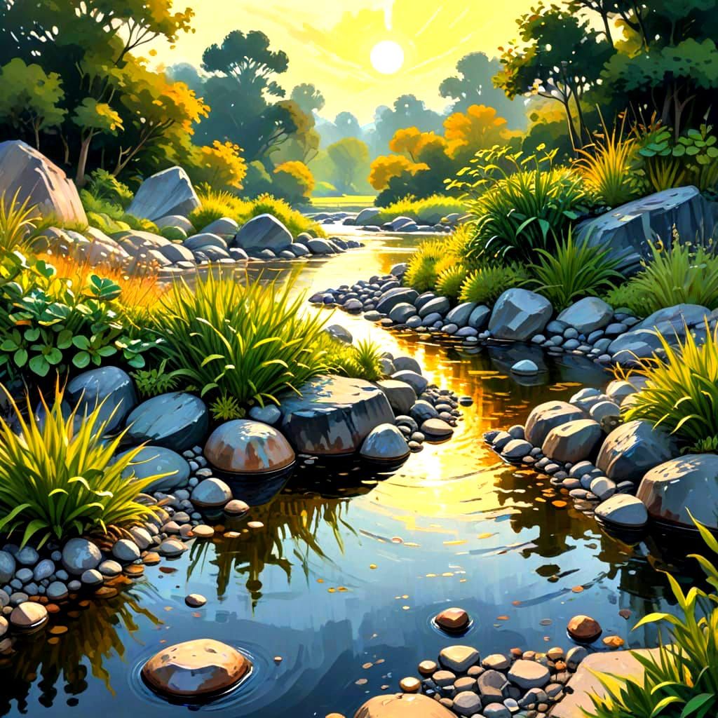This image shows a central mound of grey and black pebbles with aquatic plants. The artwork is in an impressionistic style with thick brush strokes and impasto gouache on canvas.