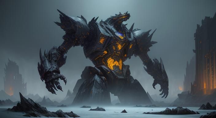 A dramatic image of a colossal, derelict dragon mecha constructed from ice and snow dominating a tundra landscape. The image is rendered with intricate detail, using a dark fantasy concept art style.
