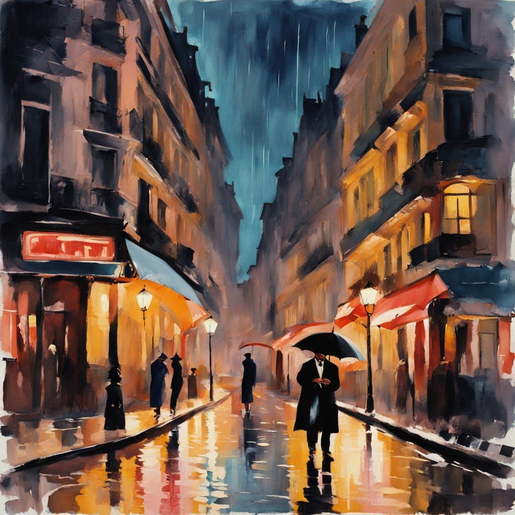 This image depicts a mysterious figure on a rain-slicked Parisian street at night, with neon signs reflected on cobblestones. It features a cinematic, romantic ambiance with dramatic lighting and deep shadows, rendered in a gouache and watercolor style with thick, textured brush strokes.
