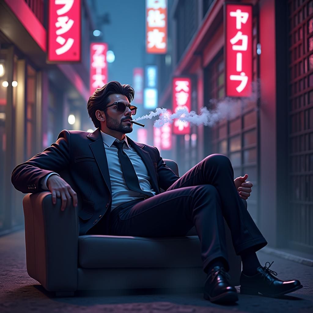 A neon-lit image of a character in a suit smoking cannabis in an alleyway. The scene blends anime aesthetics with 3D rendering, reminiscent of concept art with detailed textures and cinematic lighting.