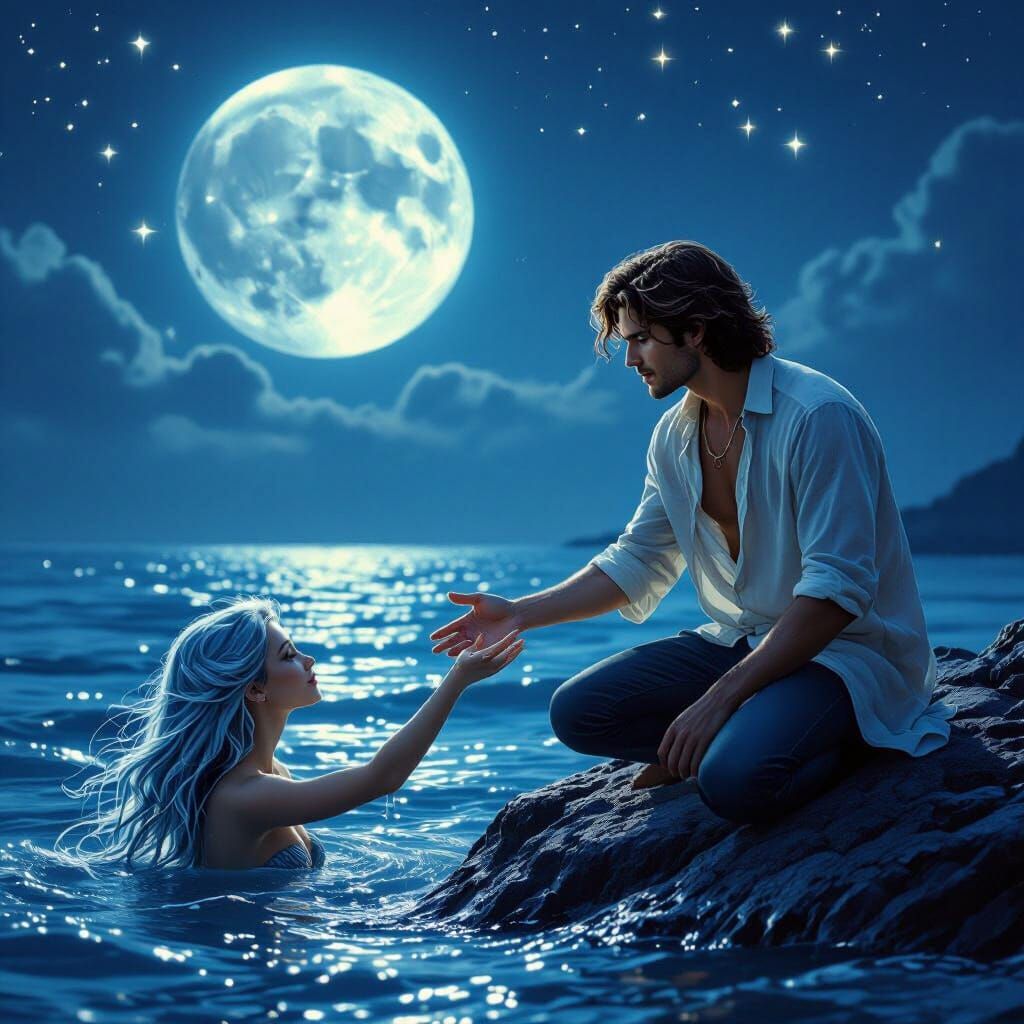 This image shows a young man kneeling on a rock, reaching towards a mermaid in the ocean under a blue moon and starry sky. The scene captures a magical connection between them.