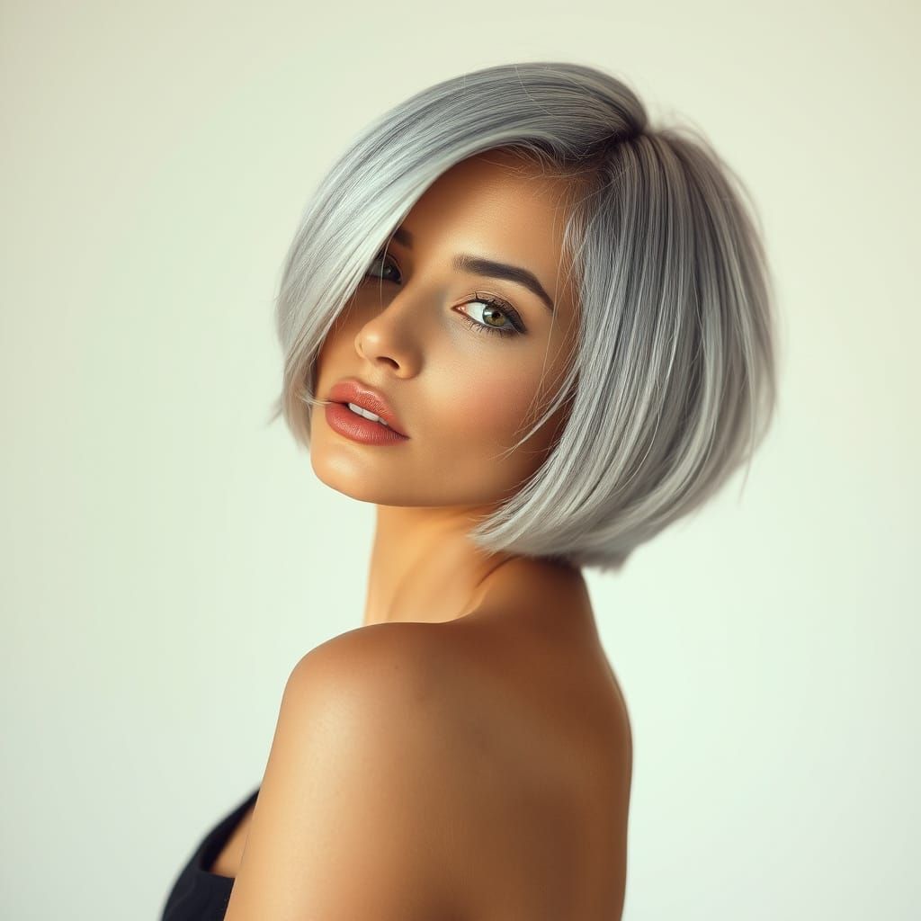 A striking picture of a woman with a silver bob haircut in a studio setting. The high-fashion editorial style image features soft, high-contrast lighting and natural hair texture details.
