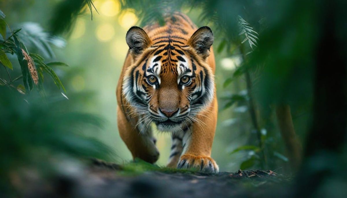 This image shows a tiger prowling through a misty forest. Captured in a wildlife photography style, the close-up shot highlights the tiger's golden fur and sharp claws in warm, natural light.