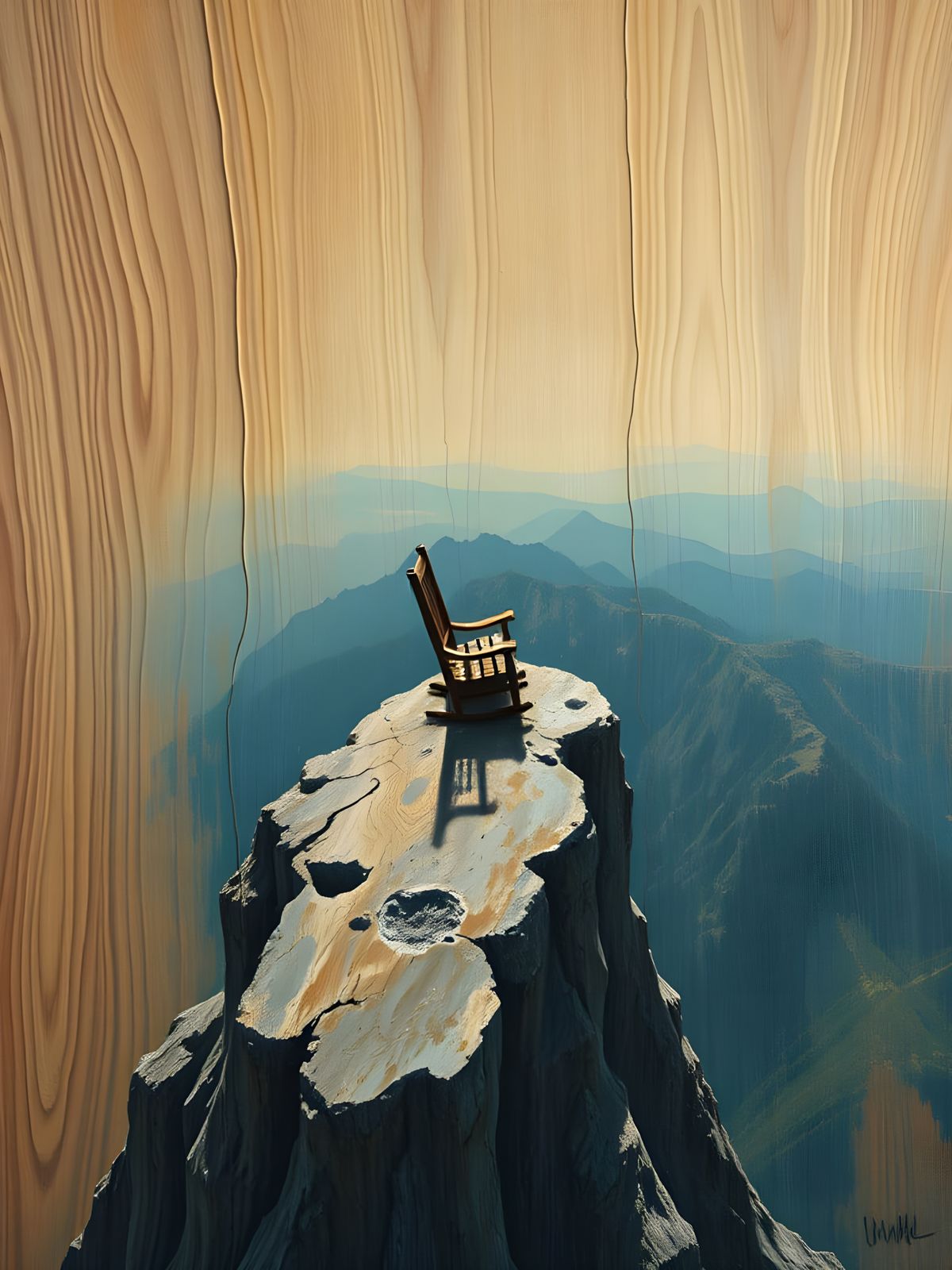 This image shows a solitary rocking chair perched atop a peak, rendered with visible wood grain and scratches. The artwork employs quick brushstrokes and dense color to enhance the vertigo effect.