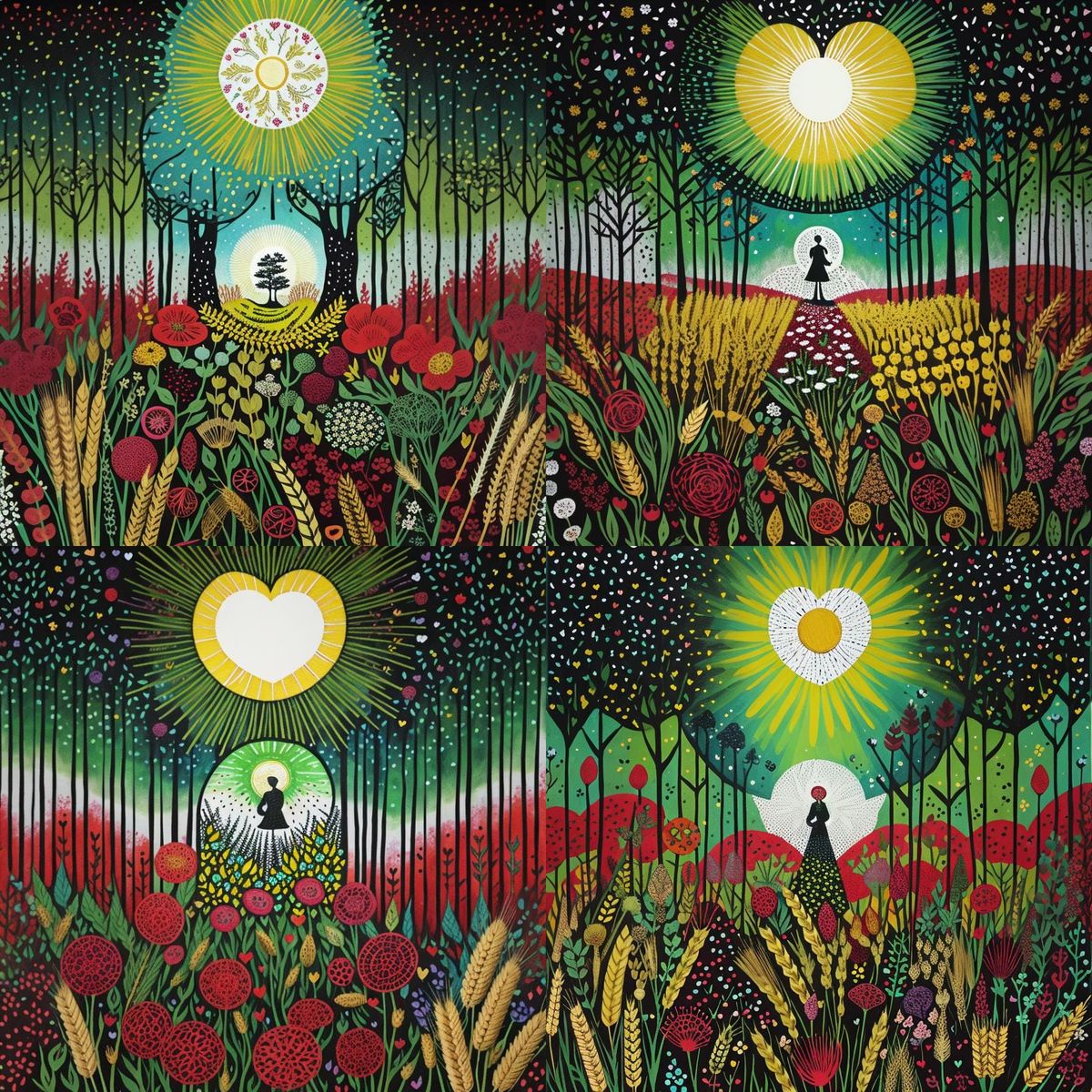This image shows a vibrant garden scene in a magical forest with flowers, wheat, and sunlight. The artwork features detailed abstract patterns in a mixed media, screen print style.