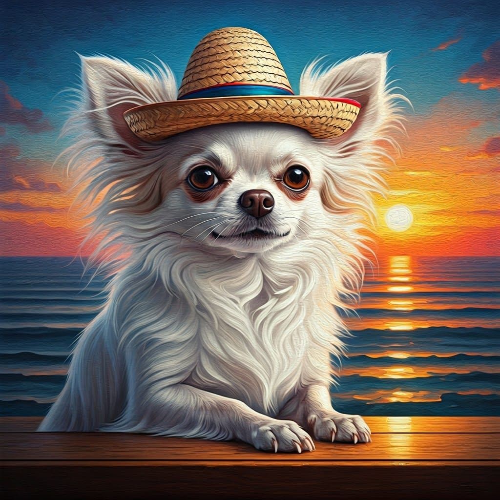 This image shows a white chihuahua wearing a sombrero at a table near the sea. The artwork is an impressionist painting with thick brush strokes and textured oil paint.