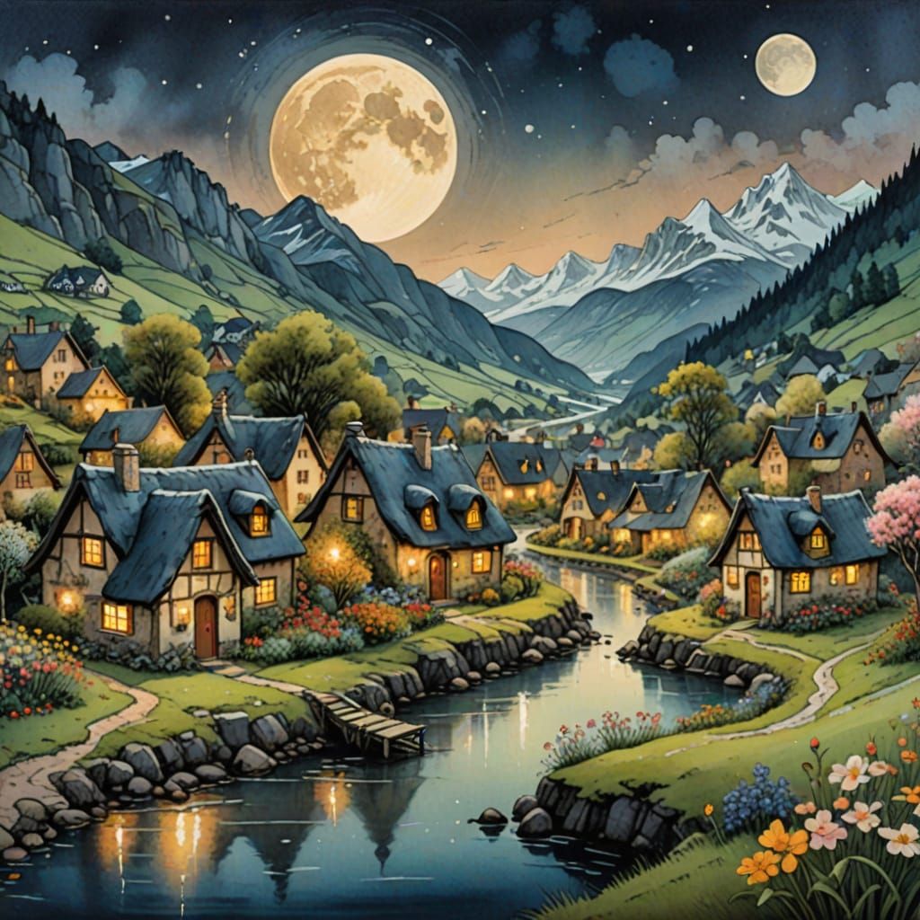 This enchanting image depicts a whimsical village nestled among mountains, with riverside cottages and vibrant flowers illuminated by a glowing moon. Created in a style reminiscent of Anton Pieck's illustrations, with subtle texture and smudges adding to the dreamlike atmosphere.