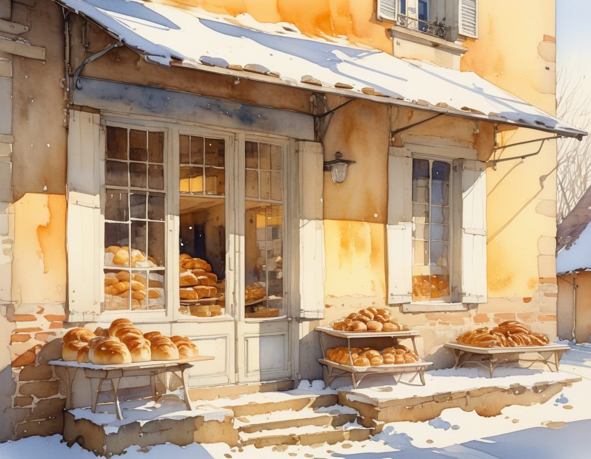 A watercolor painting capturing a sun-drenched French village bakery during winter. Features artisan breads, pastries, and a cat by the window, rendered in an impressionist style with golden light.