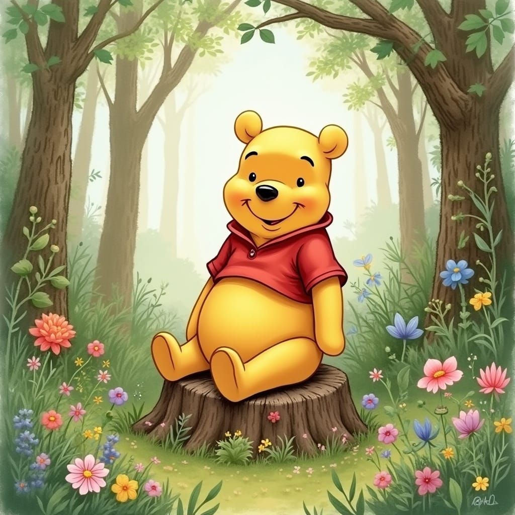 This enchanting image features Winnie the Pooh surrounded by vibrant flowers and lush greenery in the Hundred Acre Wood, exuding a sense of childlike wonder and nostalgia, reminiscent of classic children's book art and watercolor illustrations.
