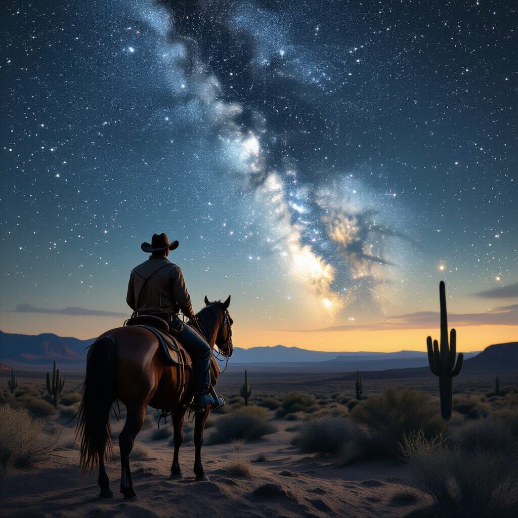 This image shows a lone cowboy on horseback contemplating a starlit desert. Cinematic lighting and surreal undertones evoke quiet solitude in this image, reminiscent of hyperrealistic digital art.