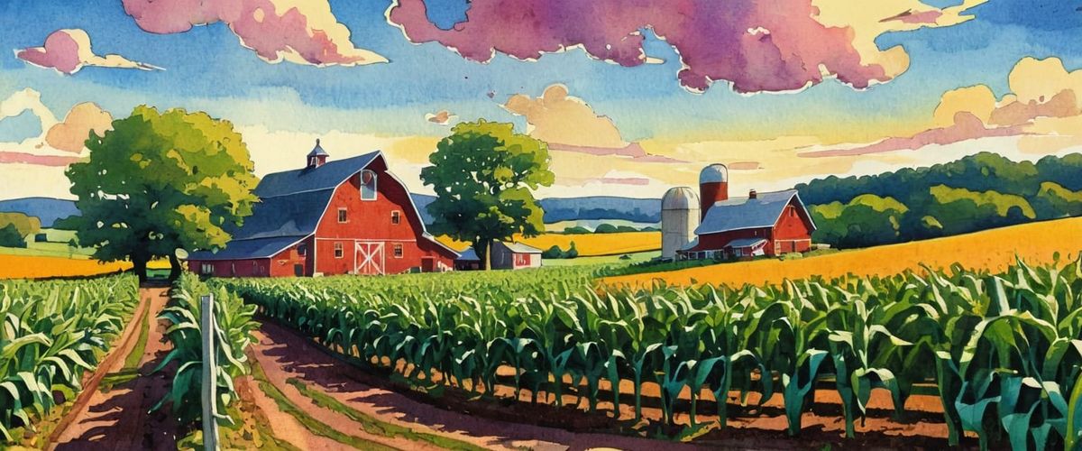 A cheerful, bright daytime scene of a farmhouse surrounded by a cornfield and trees, featuring Pennsylvania Dutch hex signs and a picnic table, rendered in a naive comic book style with watercolor and gouache textures.