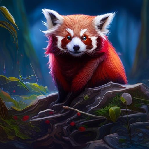This image shows a striking hybrid creature combining a red panda and an owl. The fantastical animal is presented as detailed matte painting with deep, complementary colors in 8k resolution.