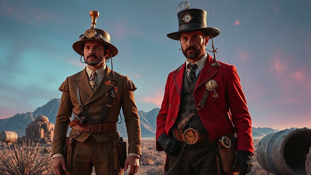 This image shows settlers in steam-powered clothing on an alien world. The scene is reminiscent of surrealist oil paintings with vibrant colors, cinematic lighting, and steampunk elements.