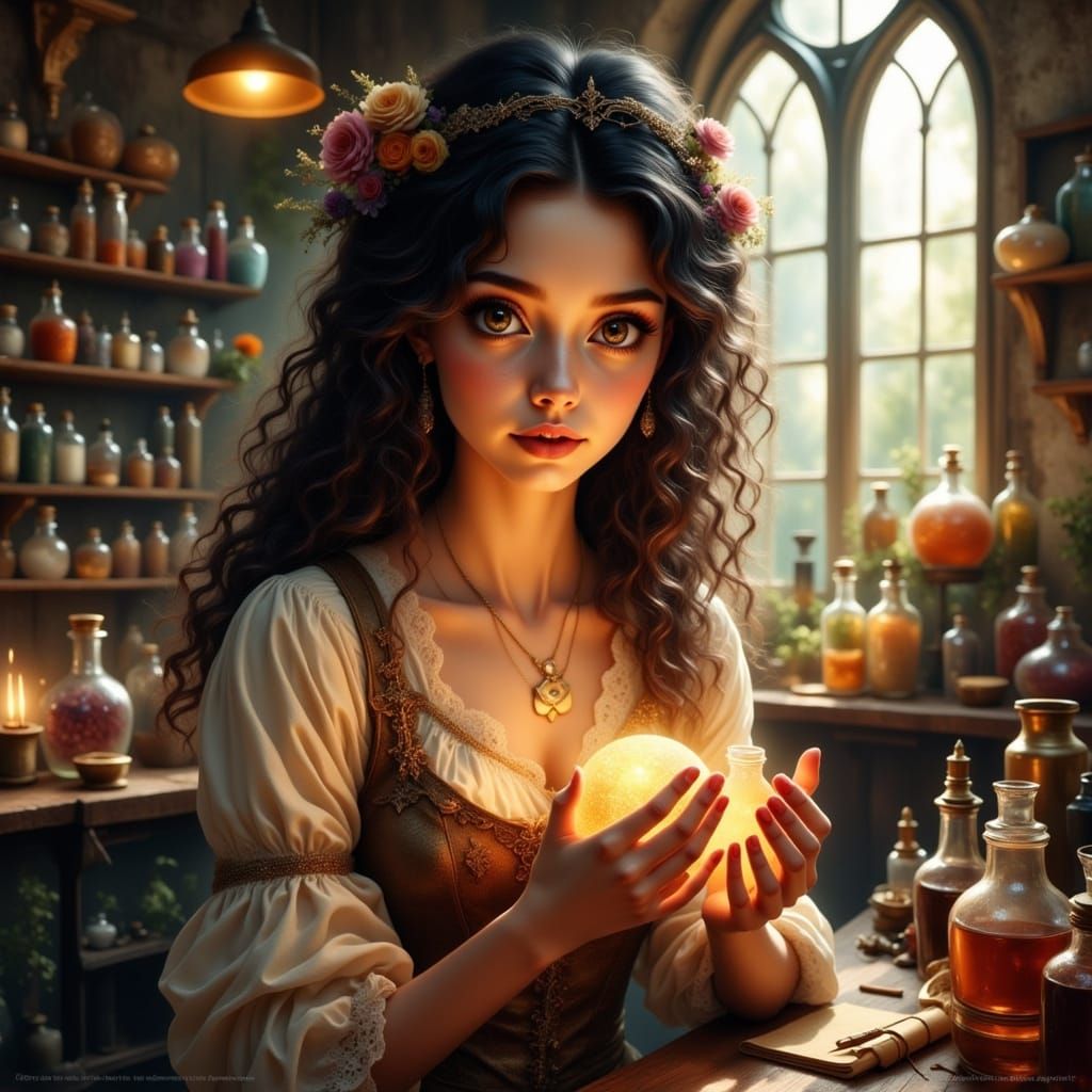 This image shows a beautiful young apothecary examining a glowing object in her cluttered, sunlit workshop. The scene, rendered with ultra-fine detail, evokes the style of an oil painting with bright colors.