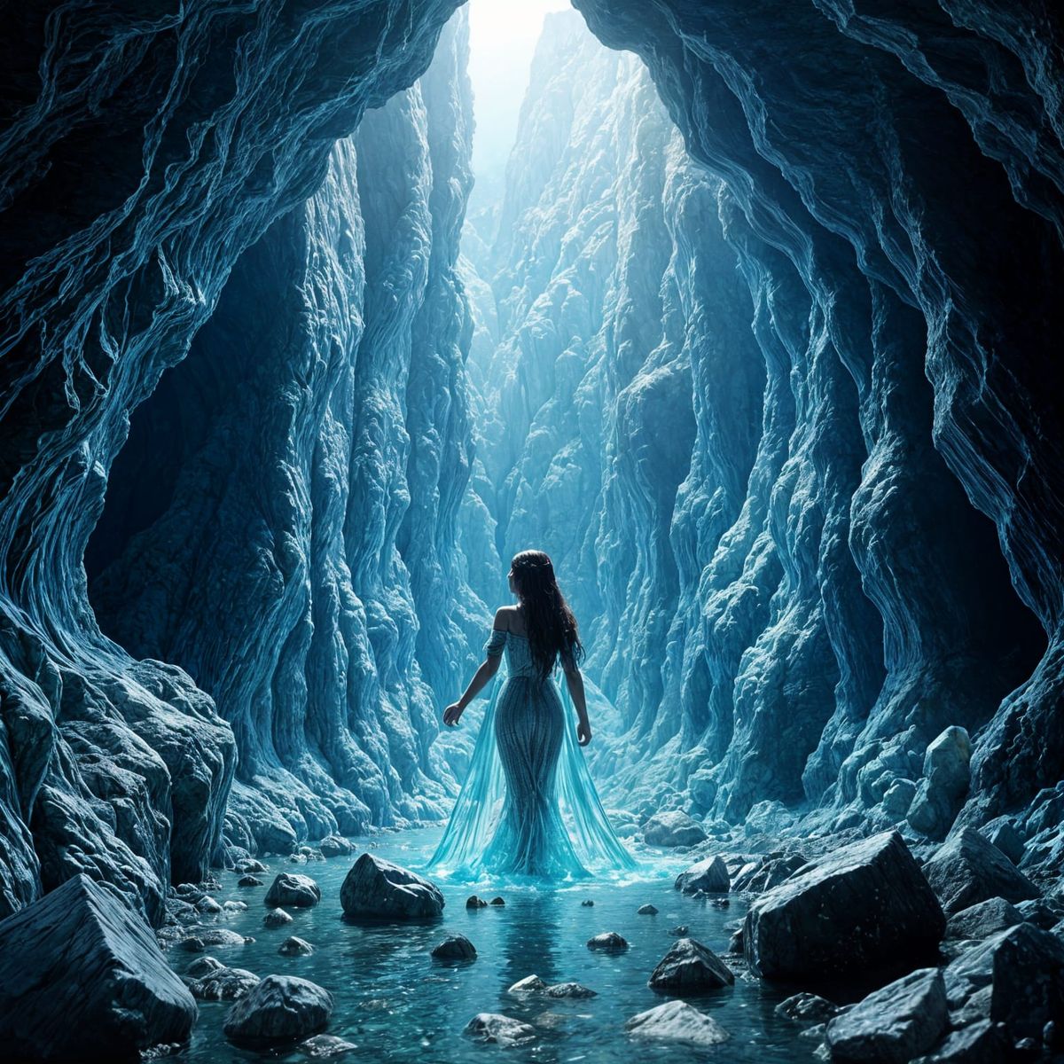 A vivid image of Ariel the mermaid in a fantasy landscape featuring a glittering aquamarine waterfall flowing between two crystal mountains. The scene is lit with hyperdetailed volumetric lighting.