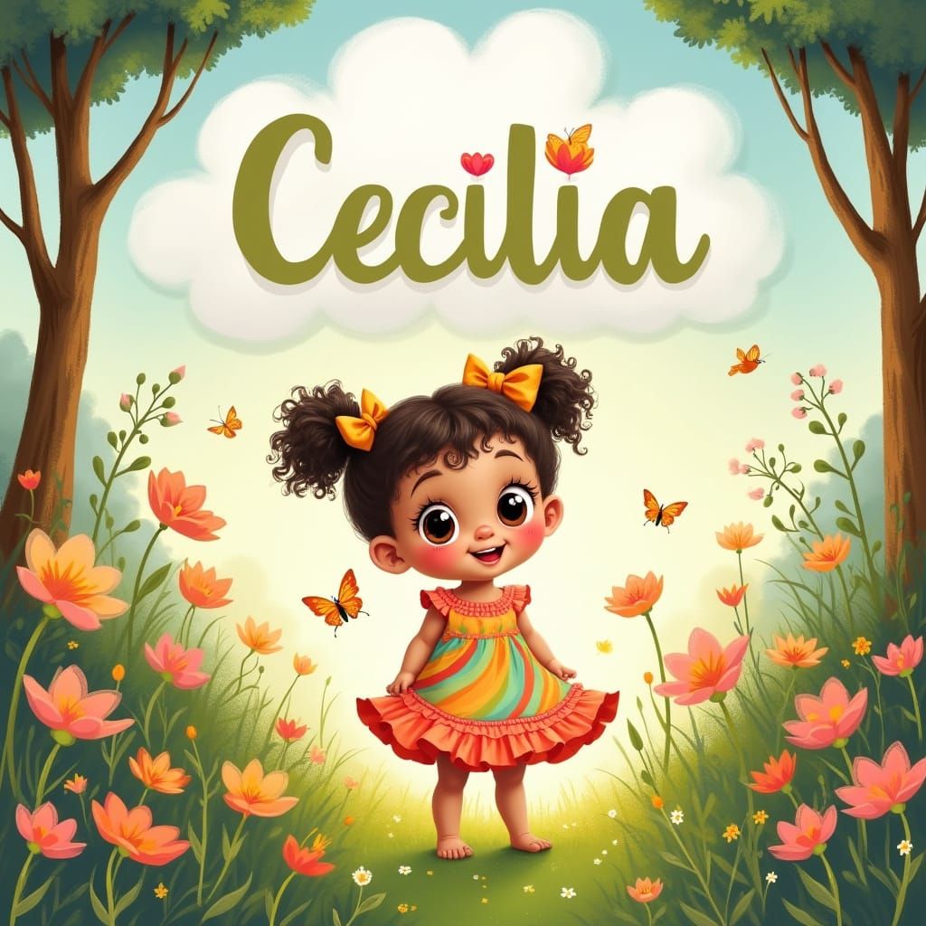 This image shows a charming infant girl surrounded by a whimsical landscape of wildflowers, tall trees, and fluttering butterflies, wearing a vibrant, frilly rainbow dress and standing on lush green grass, in a style reminiscent of classic children's book illustrations with bold lines and textures.