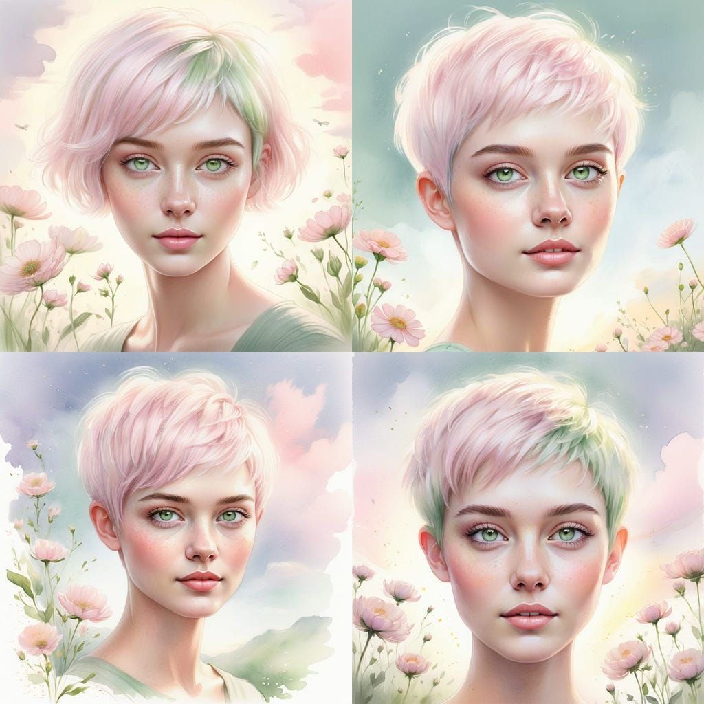A waist-high portrait of a woman with pink pixie hair and green eyes, presented in a realistic sketch style with watercolor and pencil lines, set against a soft, misty moonlight scene.