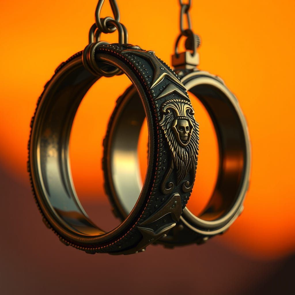 This image shows intricately detailed metallic rings against a vibrant, burnt orange backdrop, blending industrial and luxurious elements with dramatic lighting