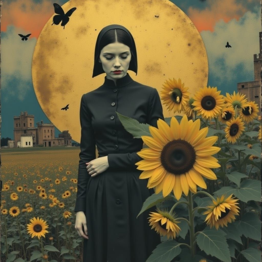 This image shows a woman in Handmaid's attire amid sunflowers and butterflies, set against a dystopian backdrop of chaos. The artwork features cool blue tones, burnished textures, and psychedelic elements, reminiscent of surrealist art.