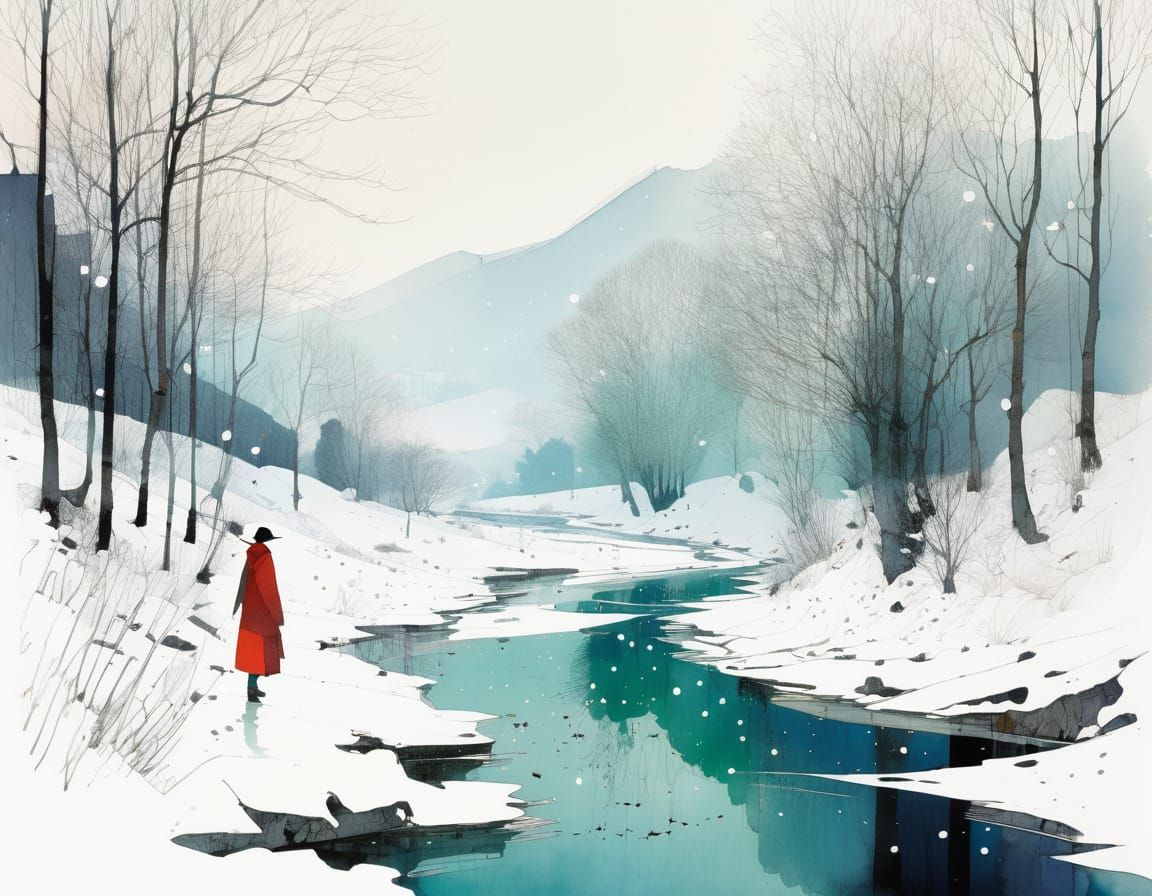 A serene image of a river flowing gently through a snowy landscape, characterized by soothing pastel hues and a sense of peaceful joy.
