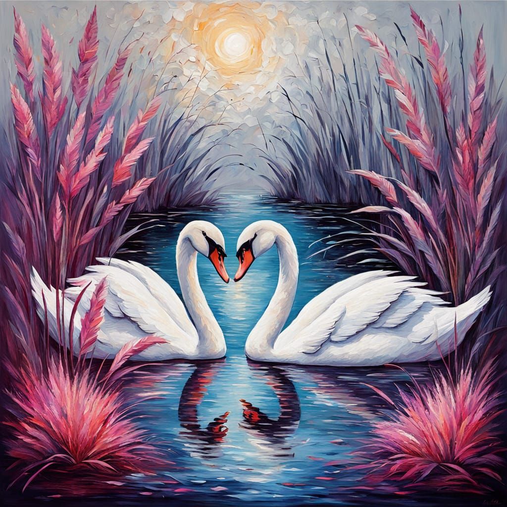 A striking picture of two swans gliding across a lake, framed by reeds and textured with whimsical urban decay. The neo-impressionistic image features peeling plaster, warm greys, and soft light.